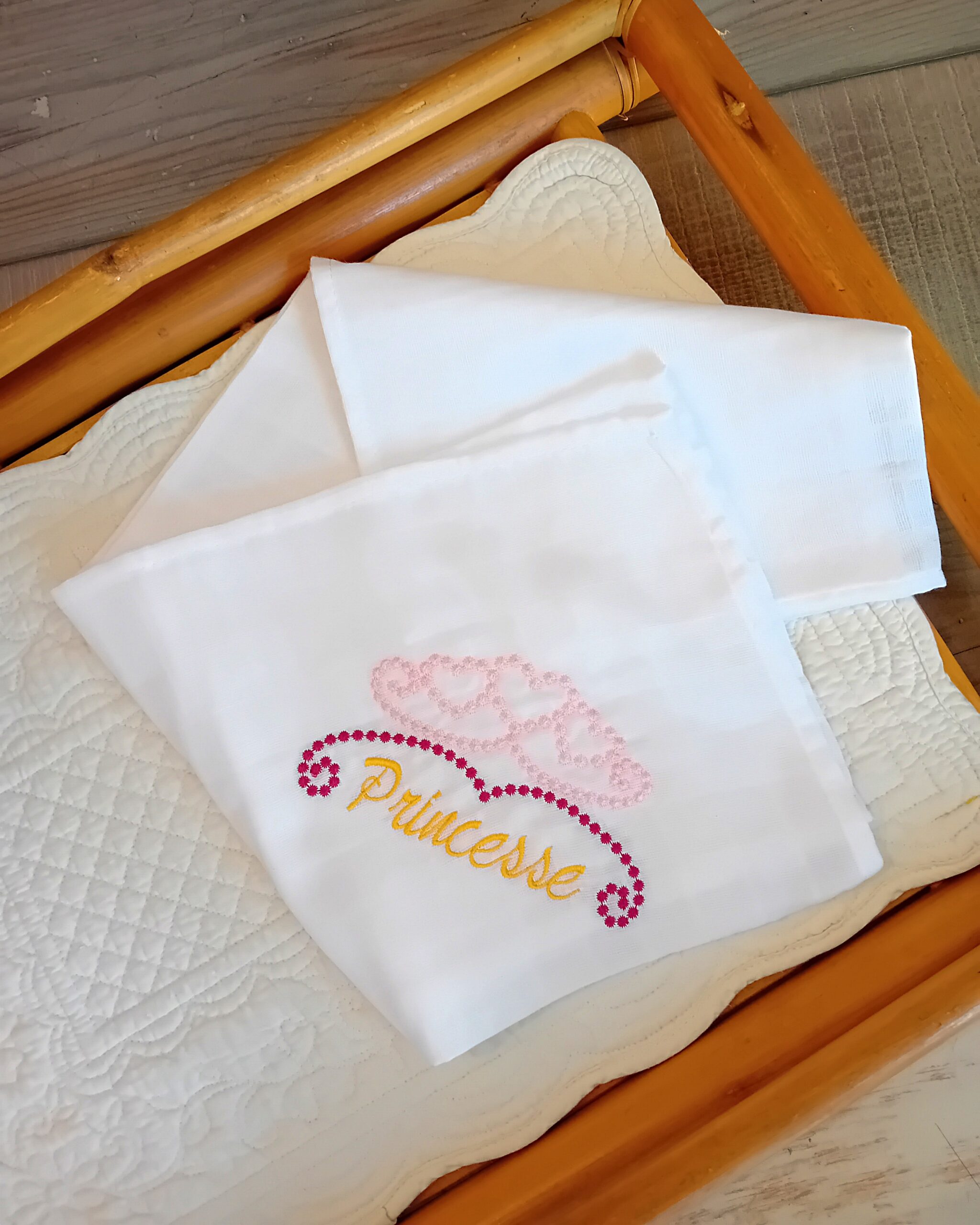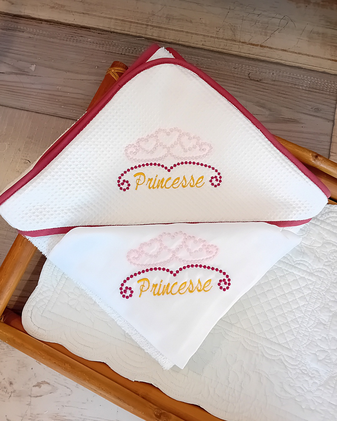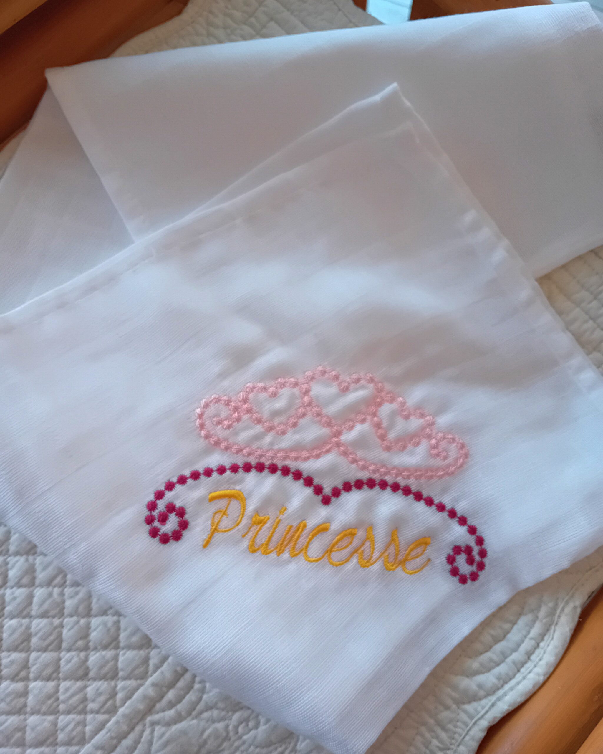 La délicate broderie “Princesse” accompagnée de sa couronne apporte une touche raffinée et poétique, parfaite pour un cadeau de naissance plein de charme.