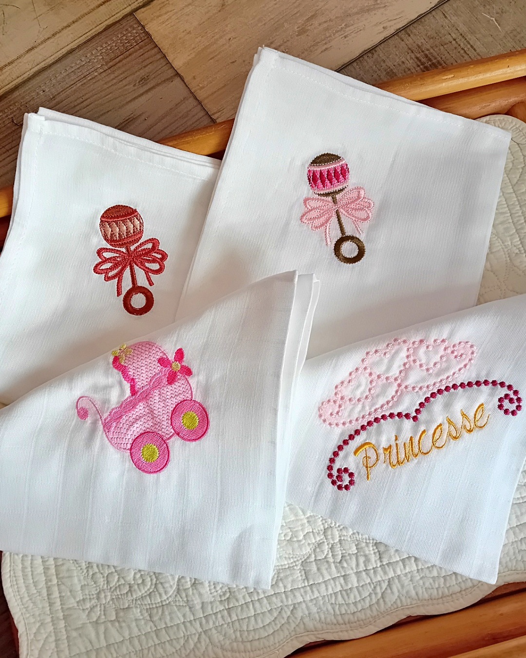 Plusieurs motifs de broderie sont proposés : princesse, hochet, landau
