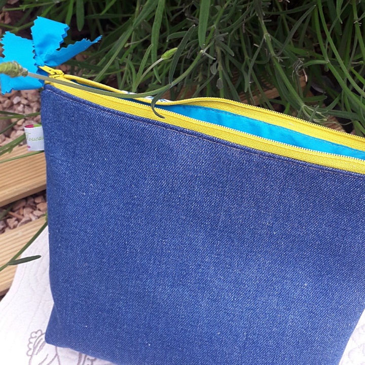✨ Fête des Mères, Noël, anniversaire ✨ Offrez une pièce unique : pochette en soie, coton & jean, ornée d’un médaillon en céramique artisanale. Format généreux, doublure turquoise, détails soignés.