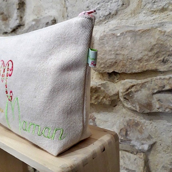 Jolie pochette pour la fête des mères confectionnée en toile de coton écru et brodée de délicates fleurs composant le M de maman.