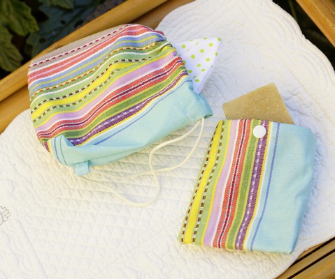 L’extérieur est en coton enduit assorti au pochon de lingettes. L’intérieur est en nid d’abeille. Ainsi, le savon sera vite sec.
