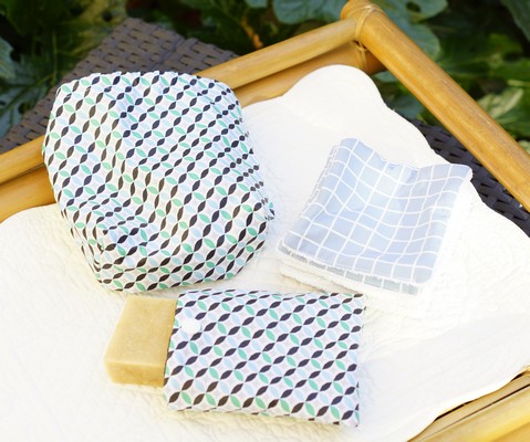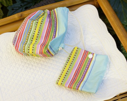 Ensemble « Mon p’tit baluchon » à rayures multicolores, composé d’un pochon avec 6 lingettes lavables et l’étui à savon solide assorti.