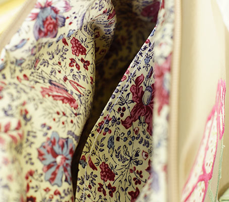 L’extérieur est confectionné en simili cuir taupe avec broderie de fleurs sur le devant.